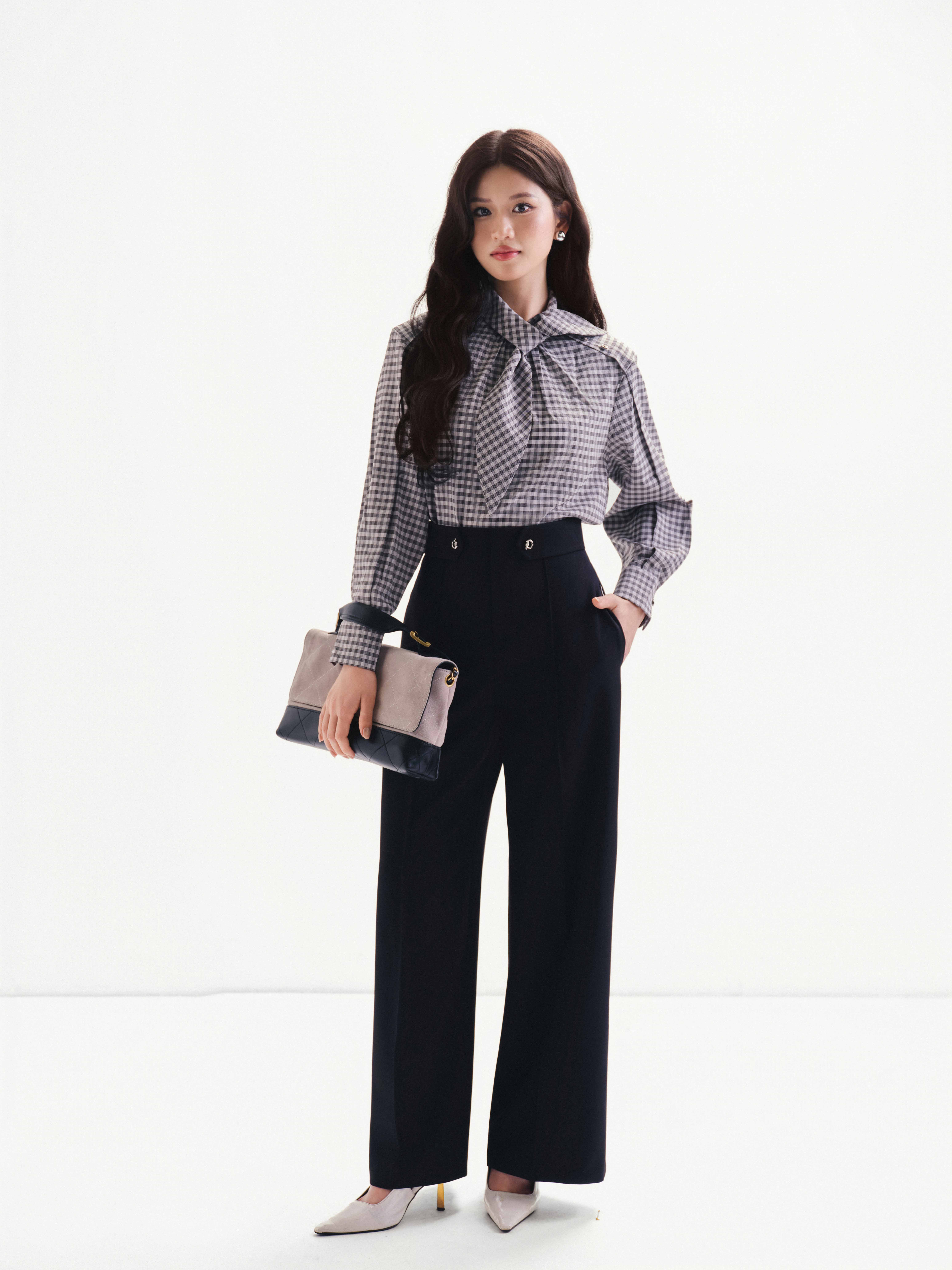 Áo kẻ cổ nơ tay dài