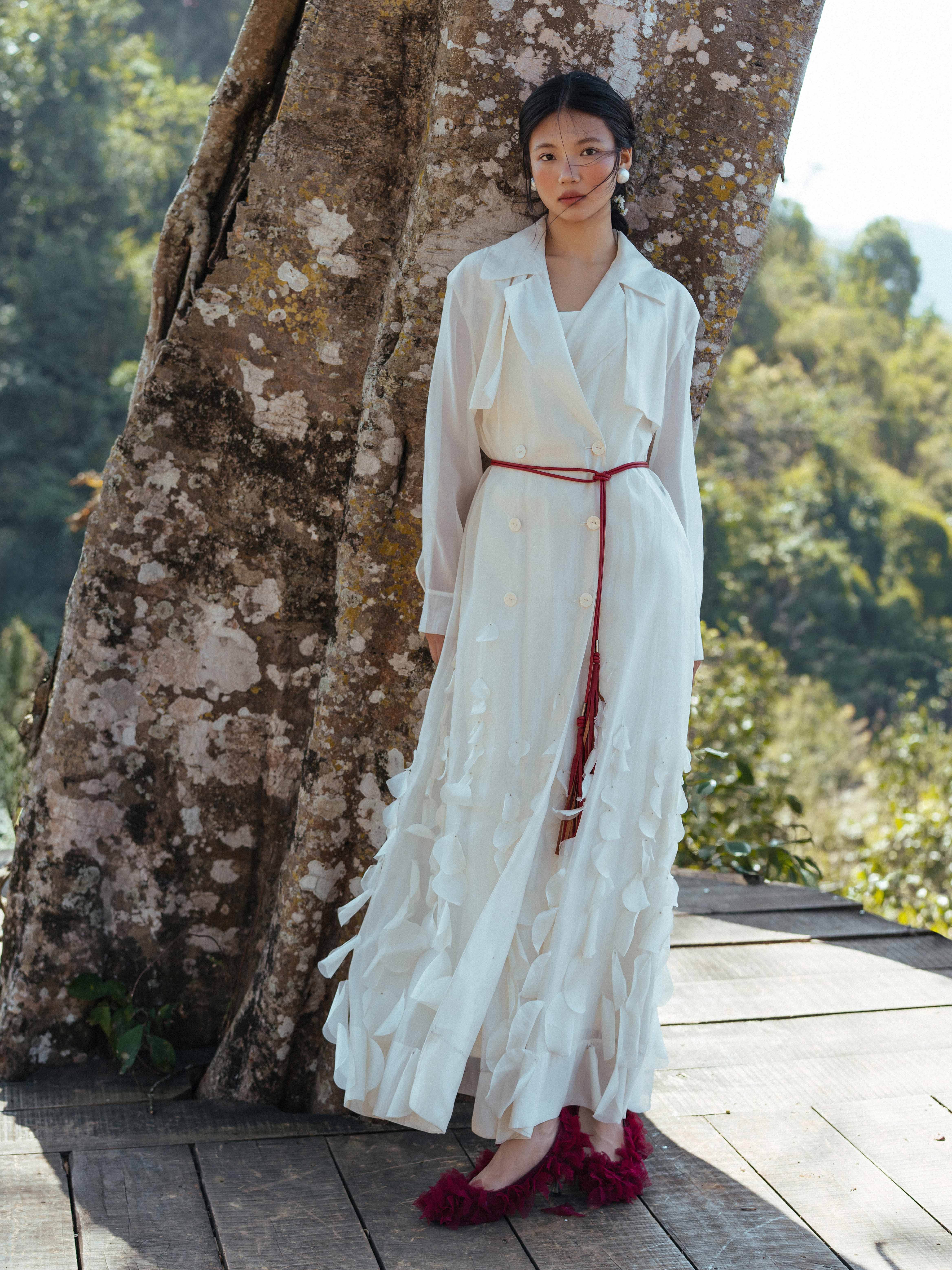 Áo khoác tơ đính cánh hoa kèm dây da