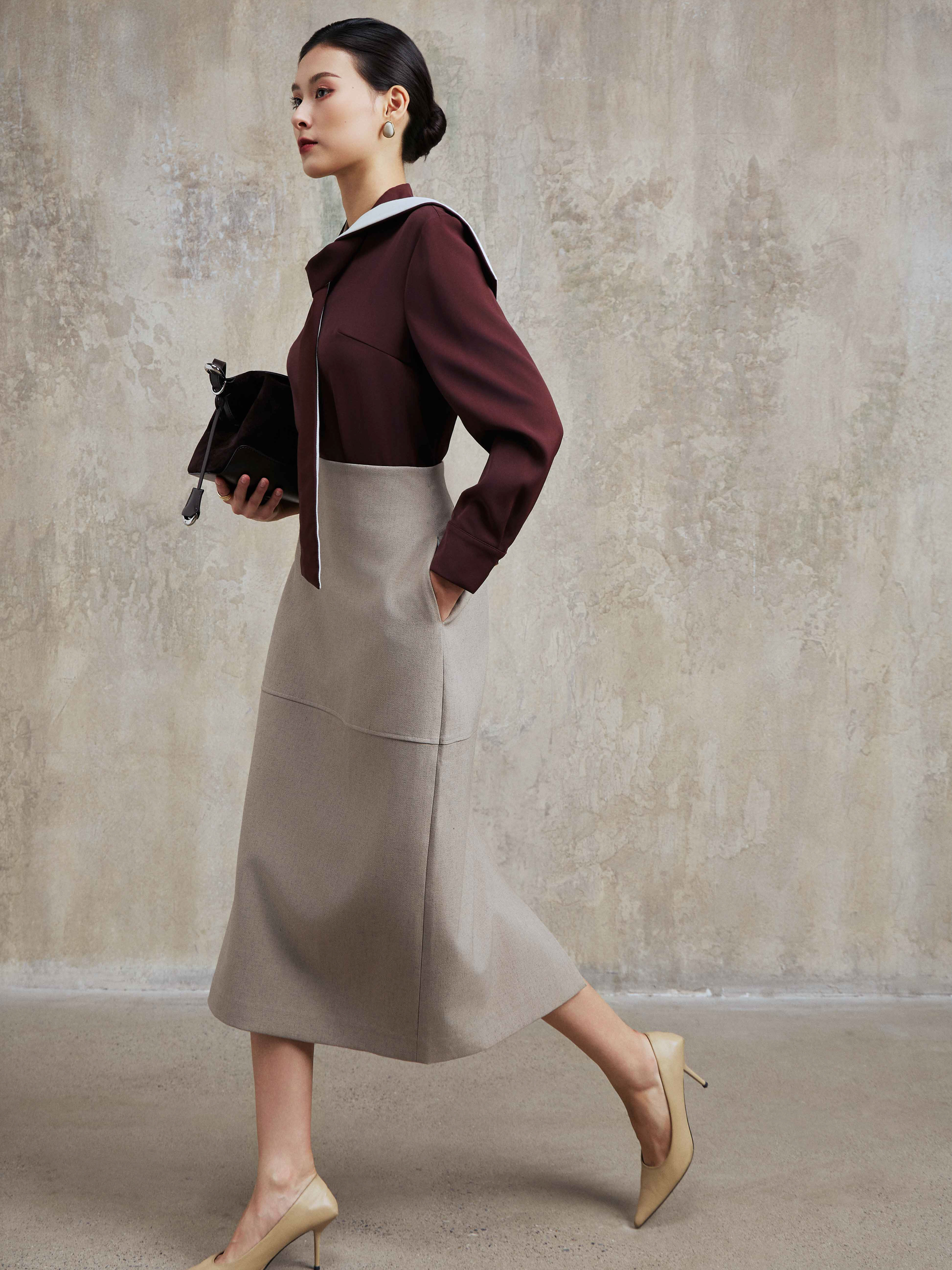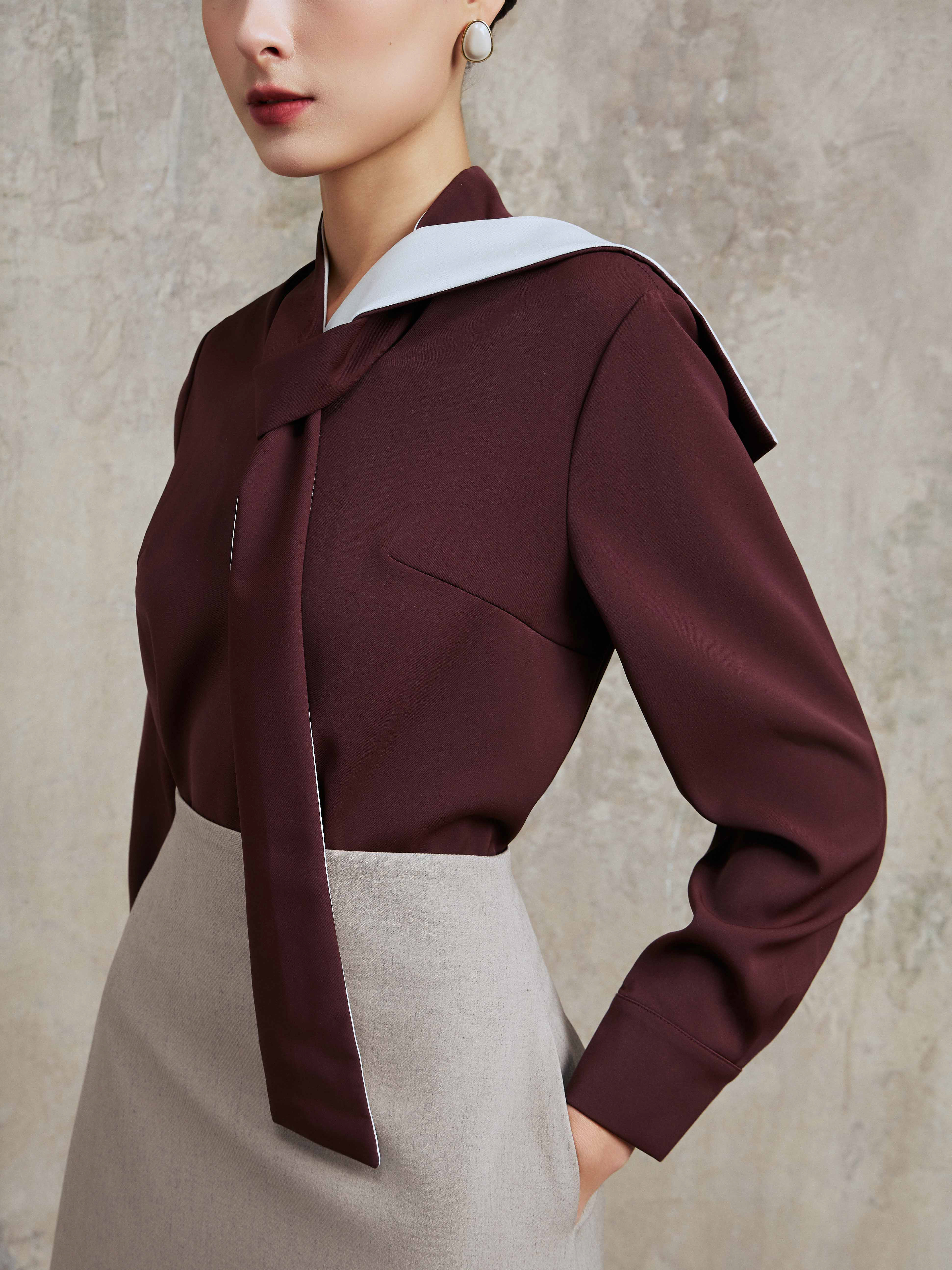 Cổ tròn, khăn cổ 2 mặt đính liền buộc nơ tùy ý