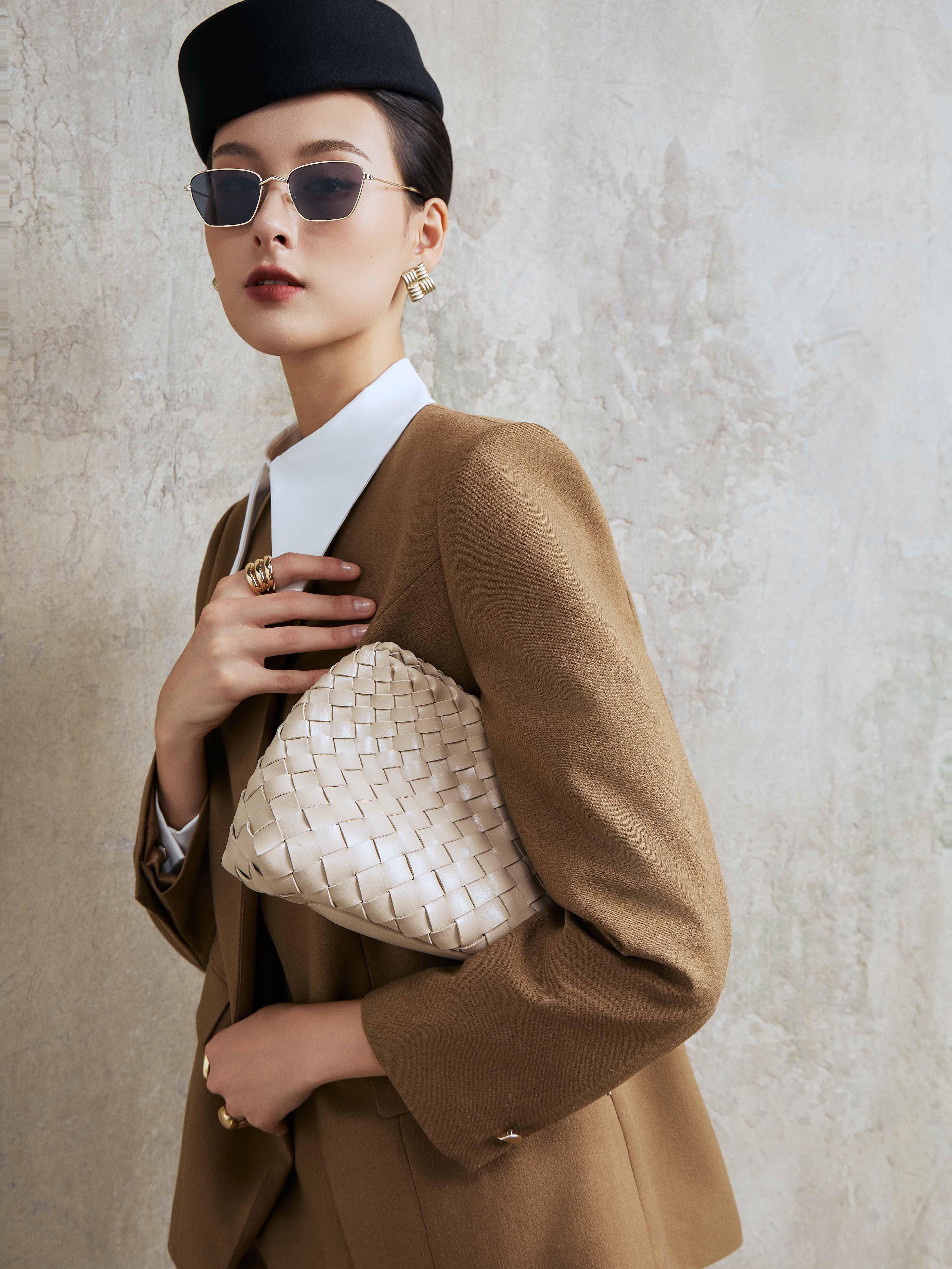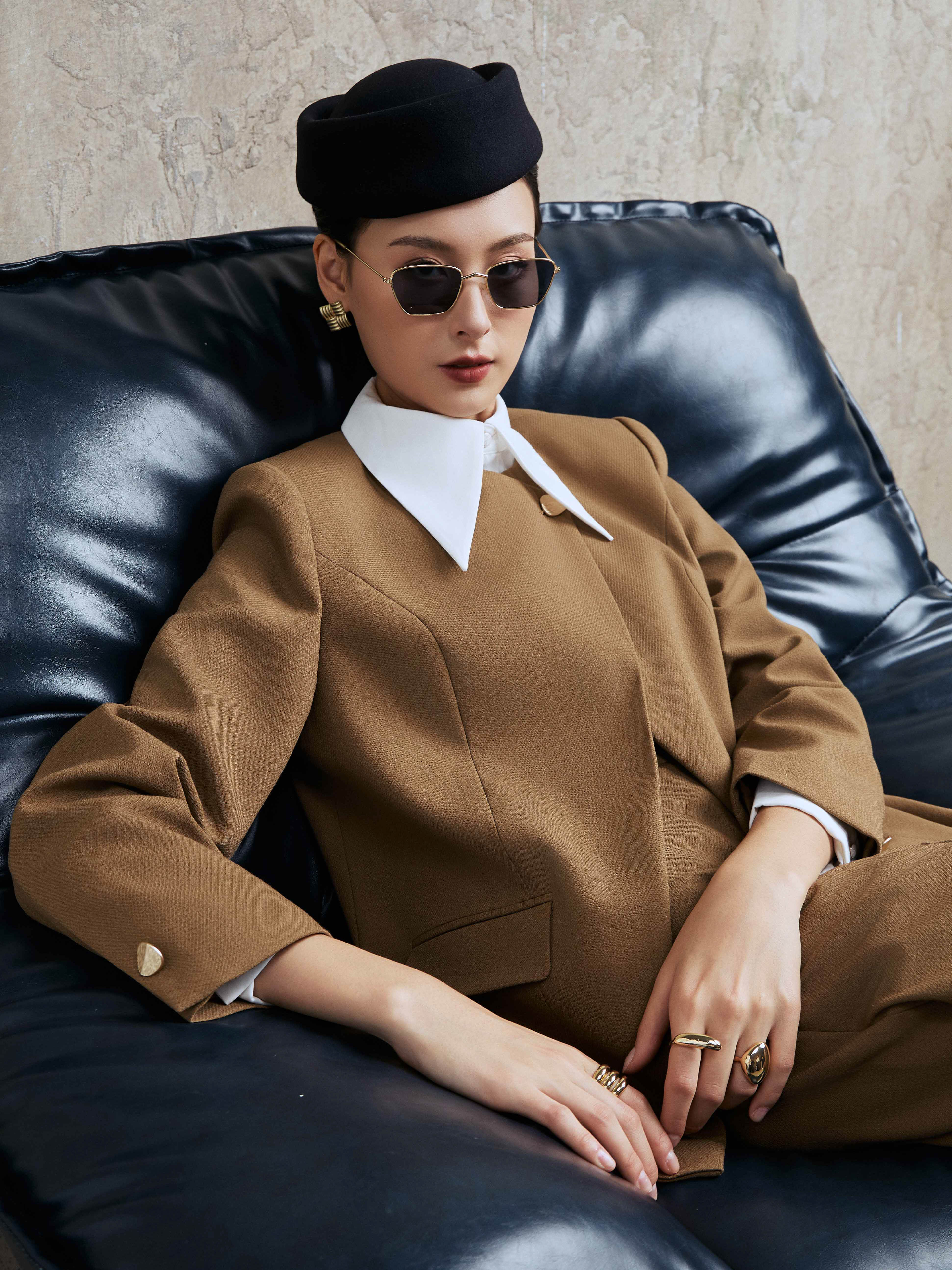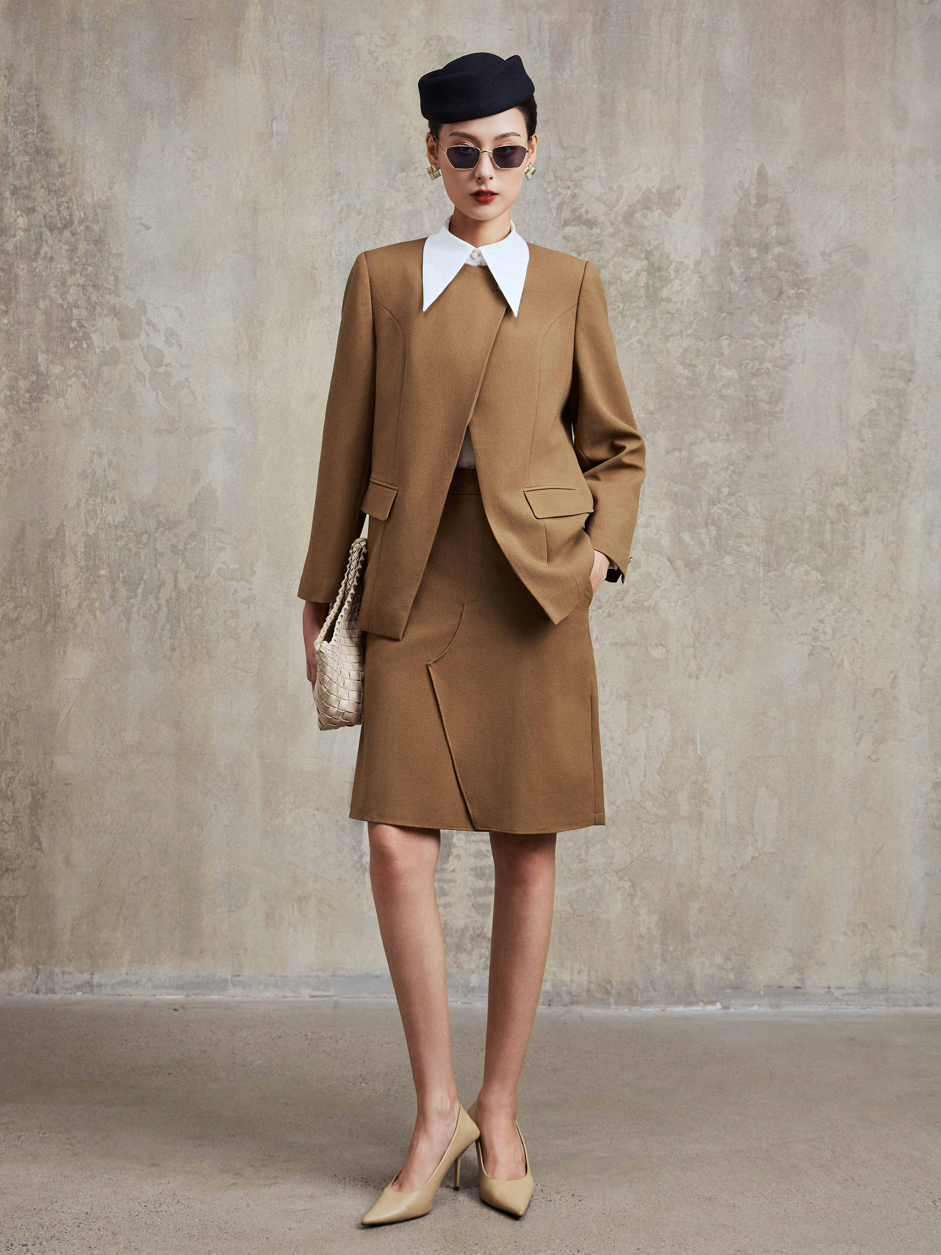 Chất liệu: Thô tuytsi Blazer dáng suông Cổ áo không có ve áo, cố định bằng 1 khuy bên trên 2 túi ốp giả Có độn vai Xẻ vạt chéo không đối xứng phía trước |