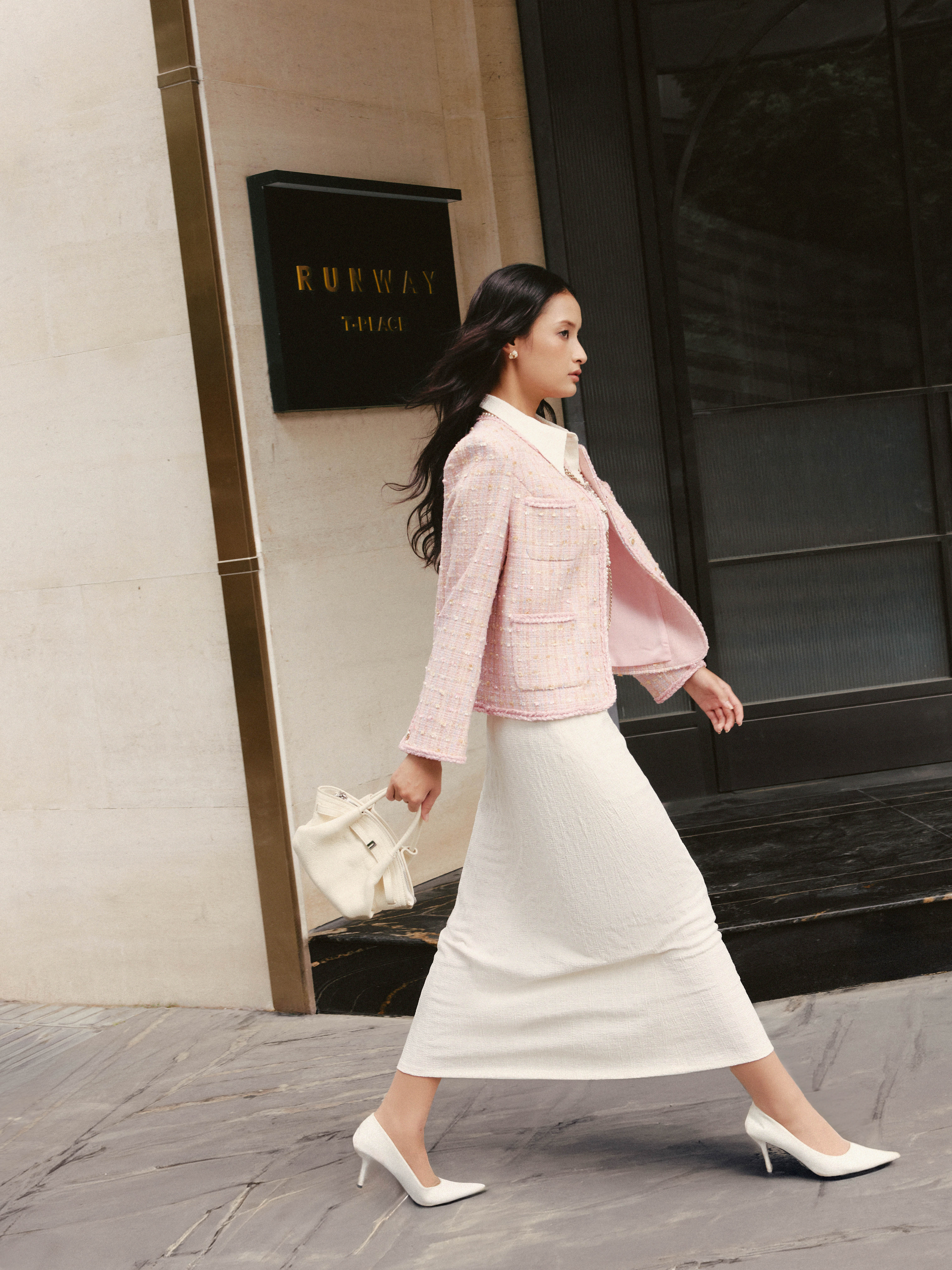 Áo vest dạ tweed kẻ ngang phối viền 4 túi ốp