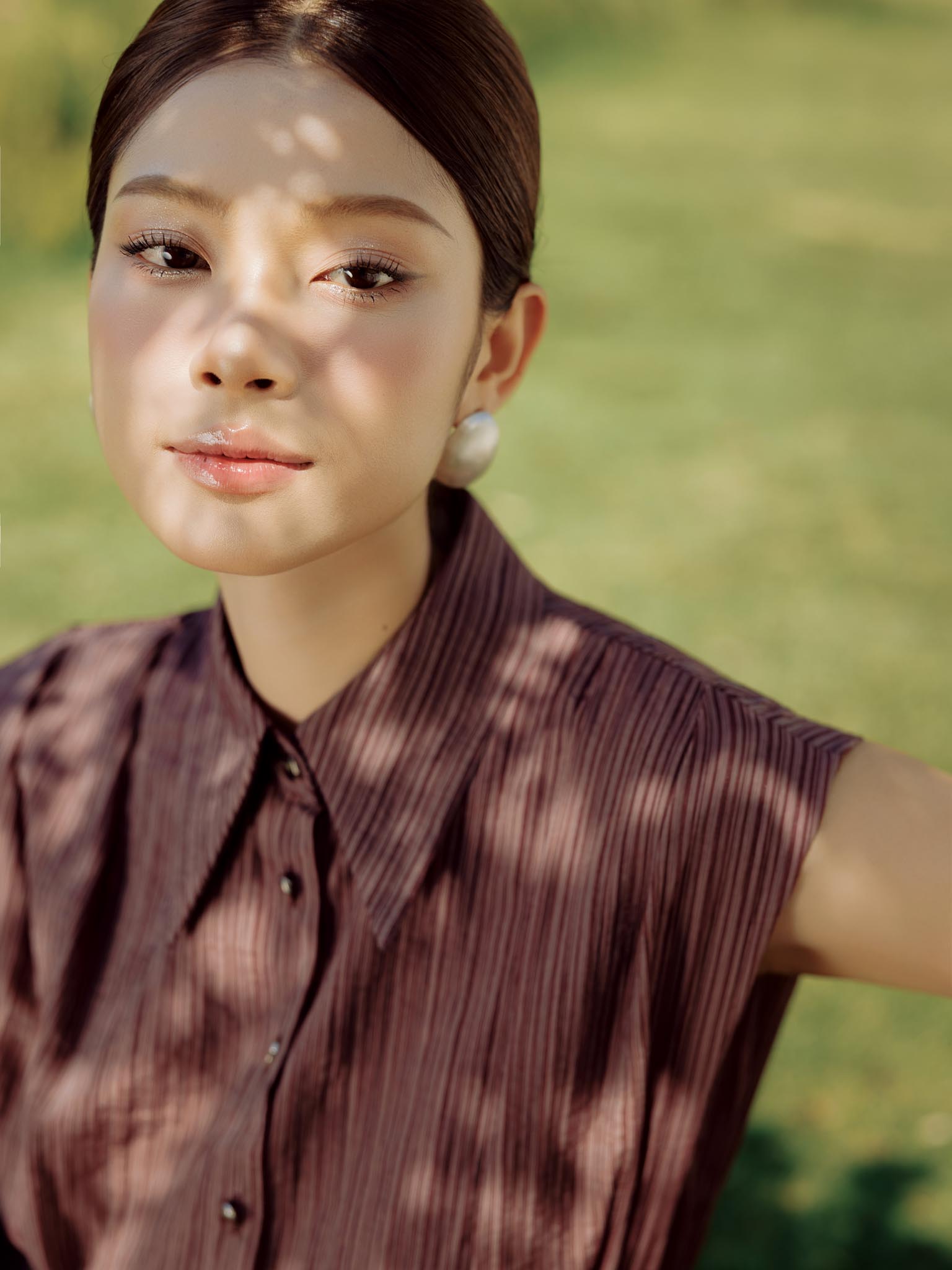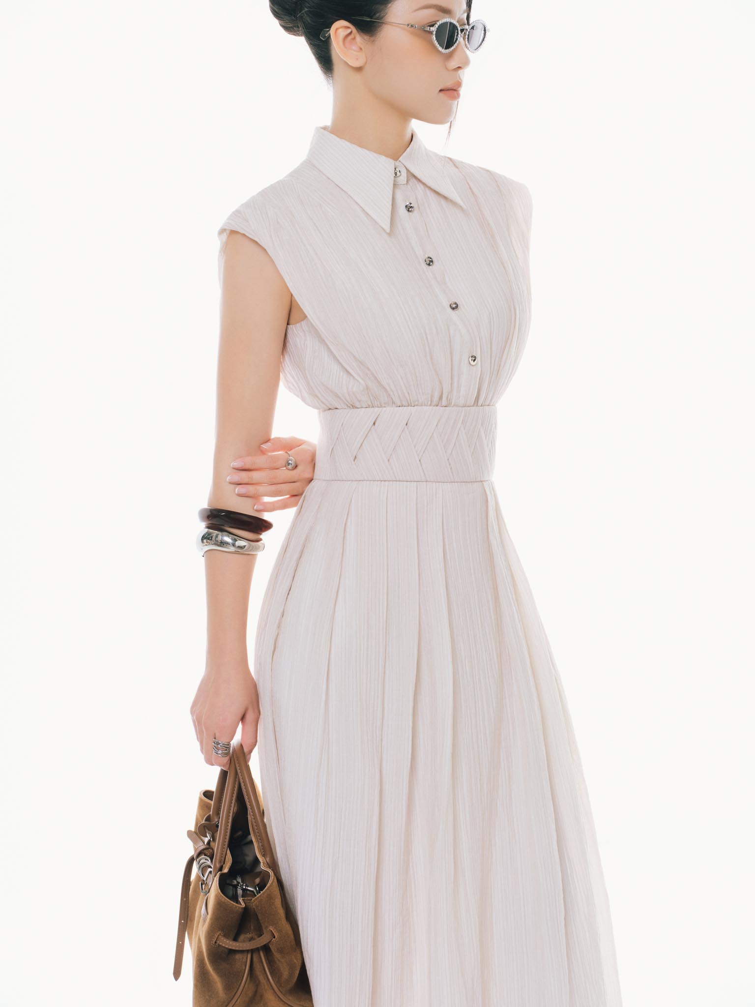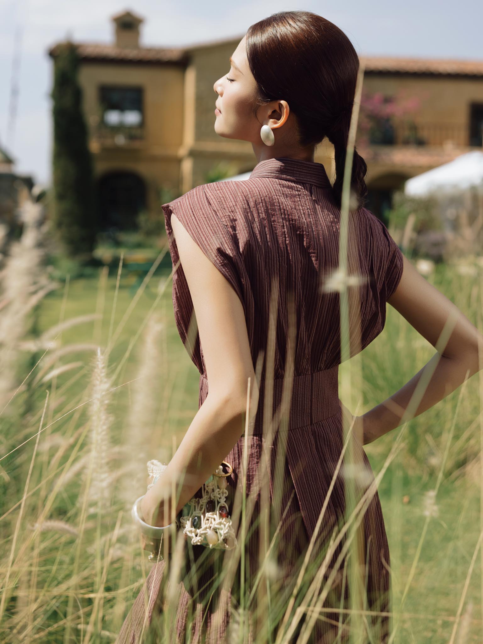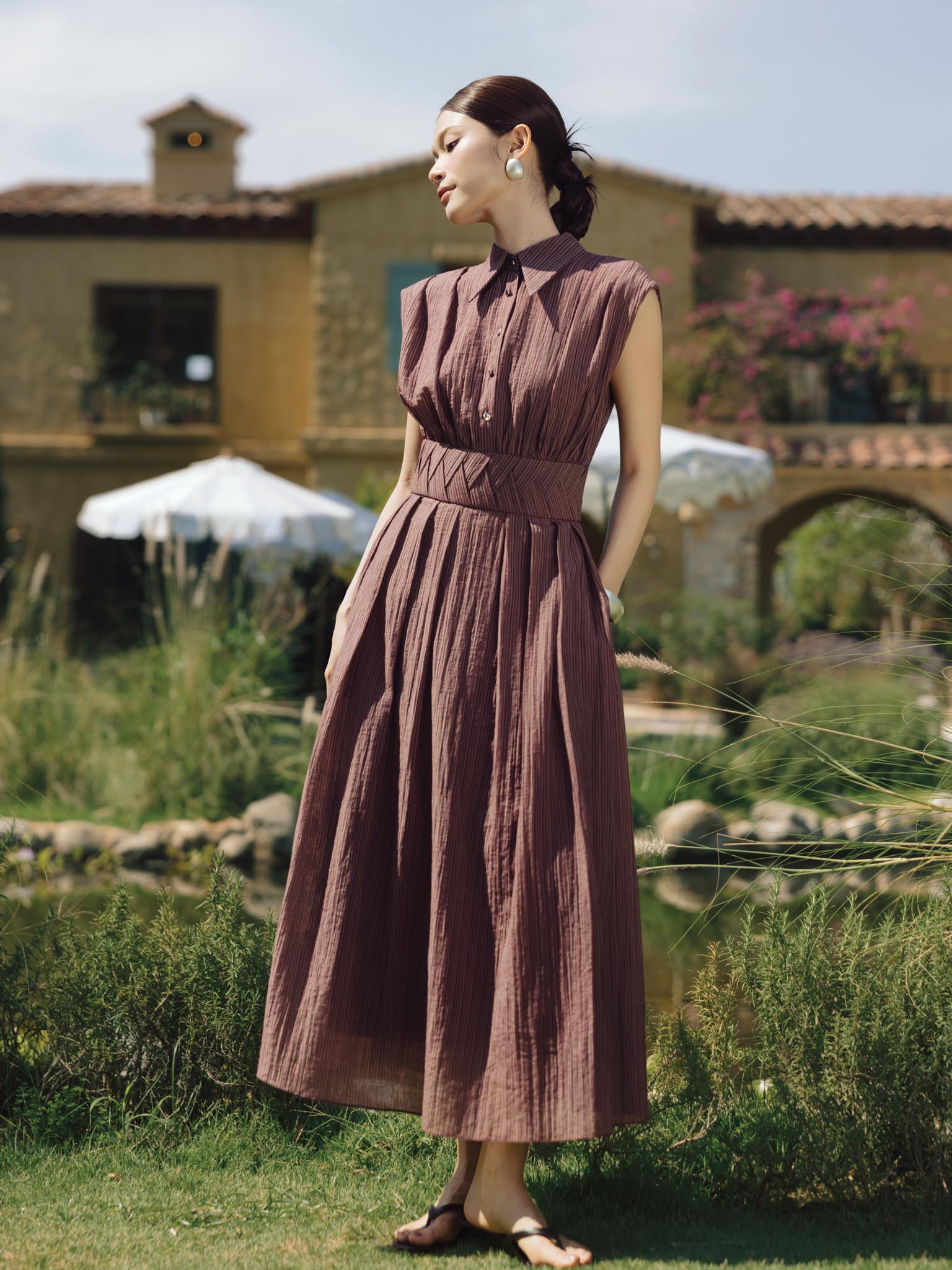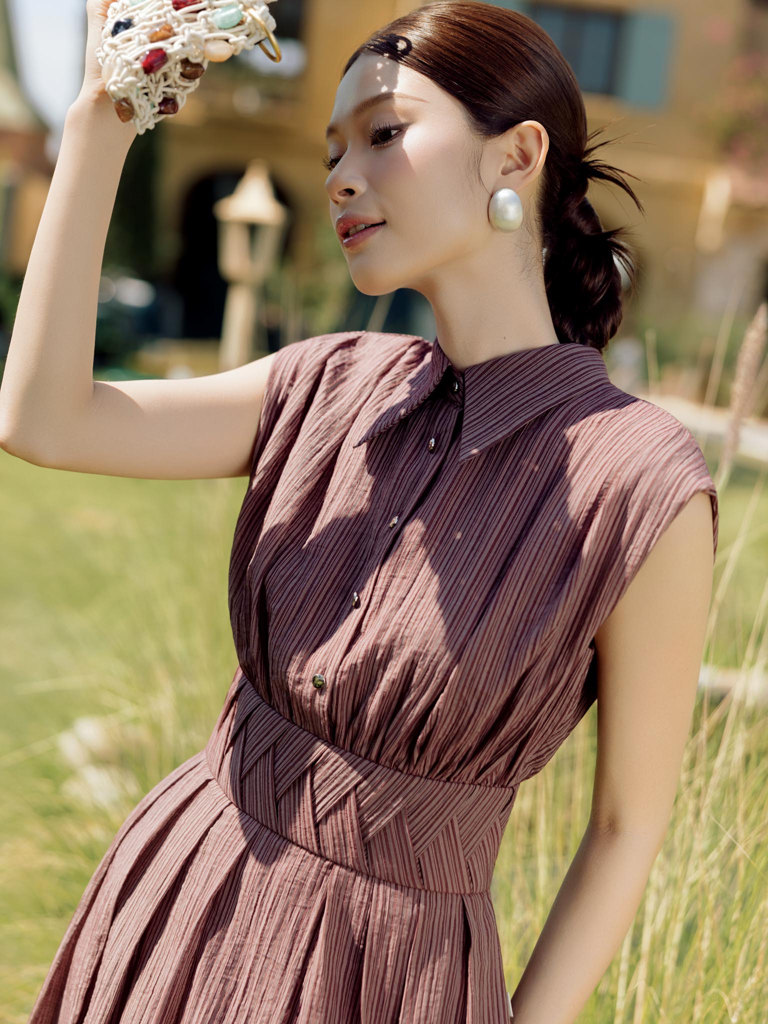 Váy kẻ vai chờm xếp ly, cạp eo bản to