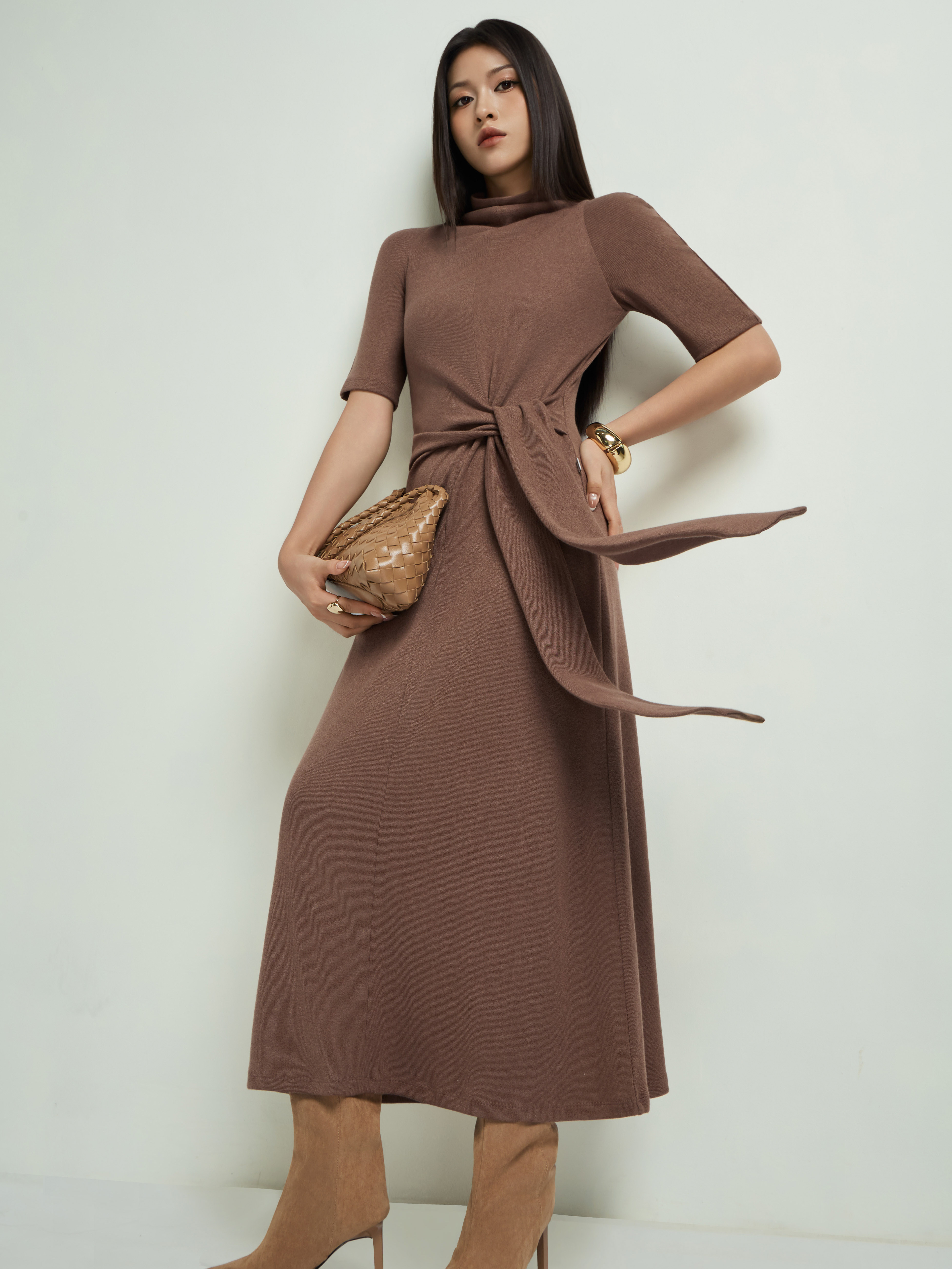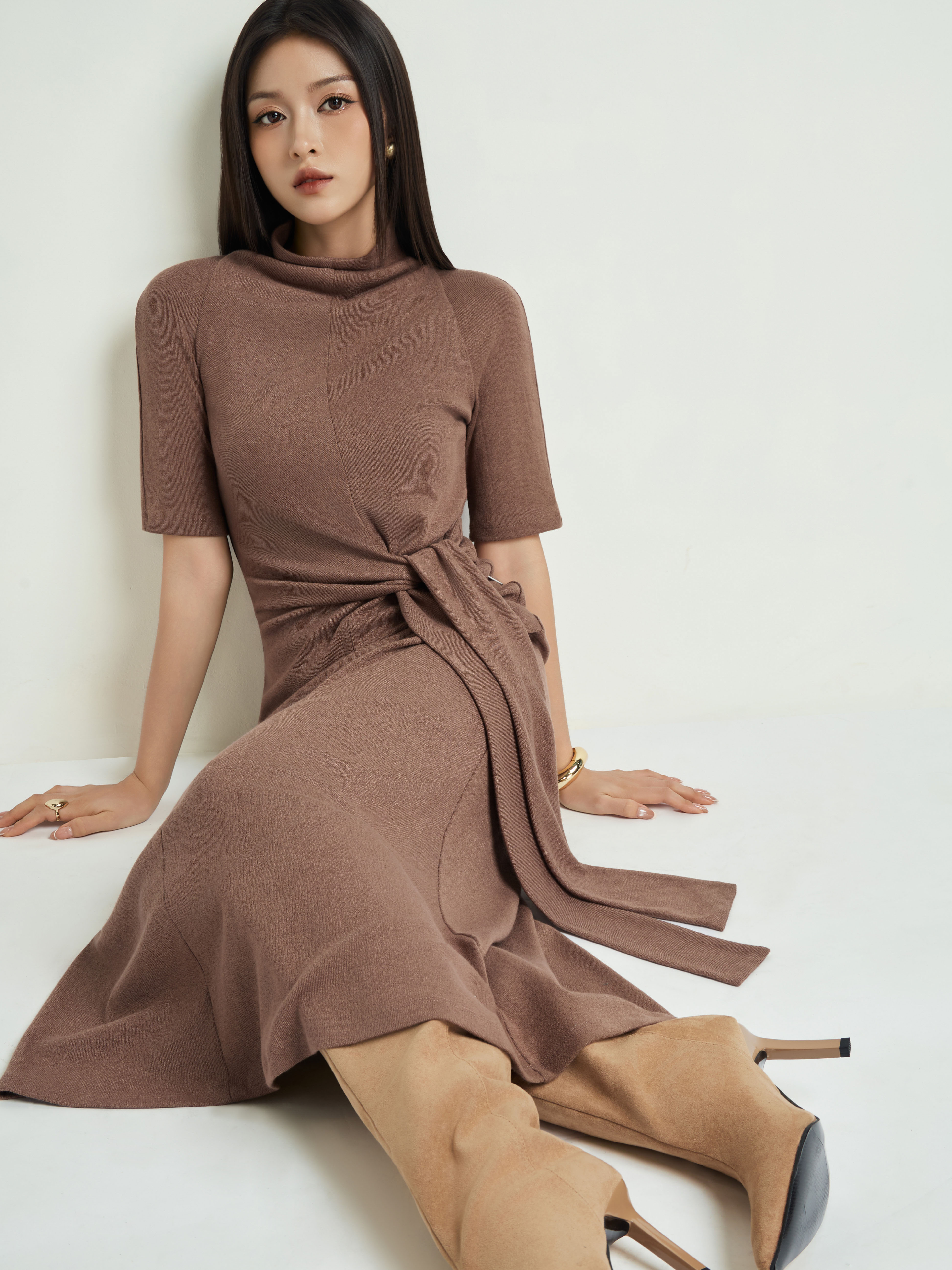 Váy len tay cộc thắt dây eo