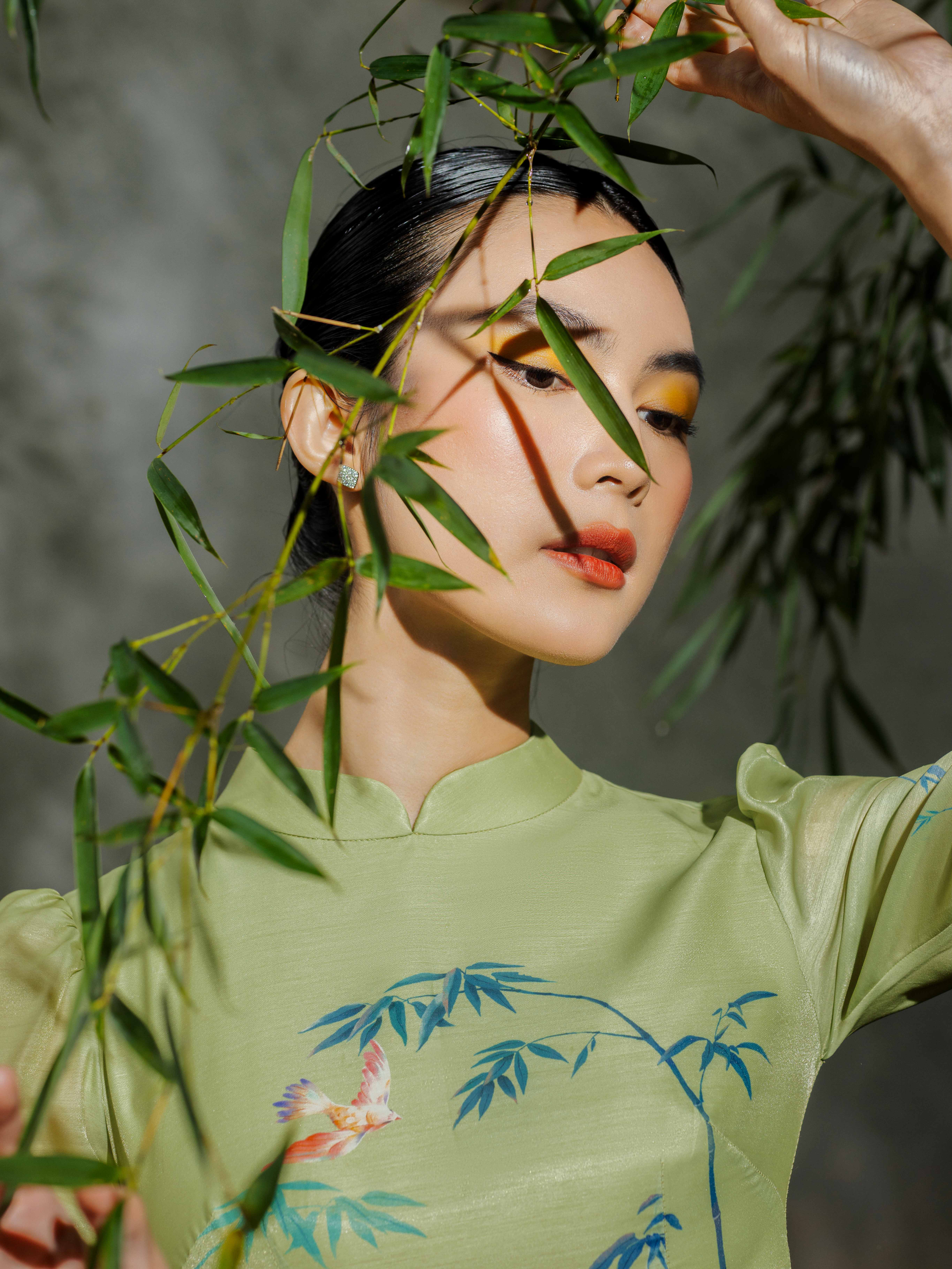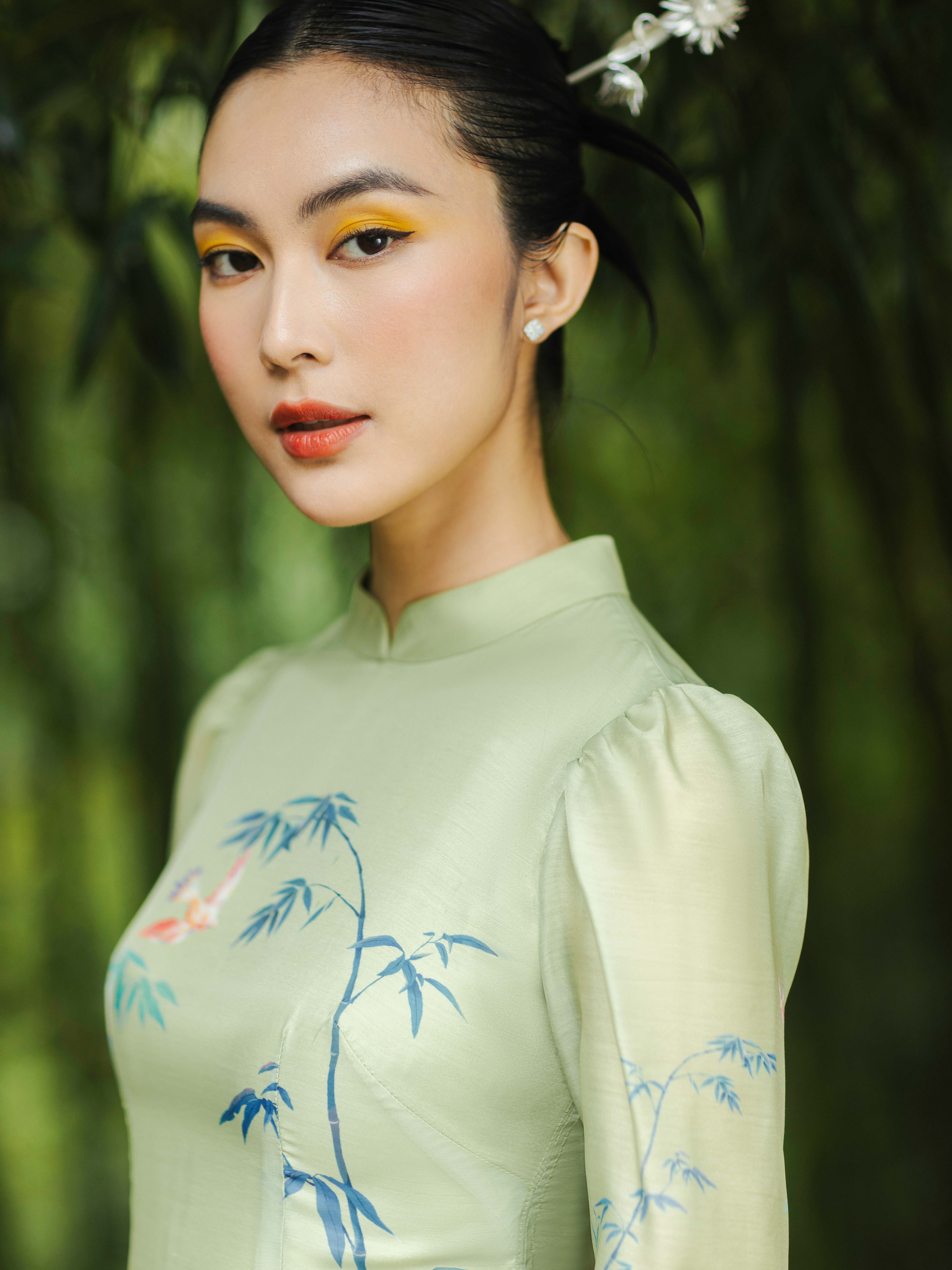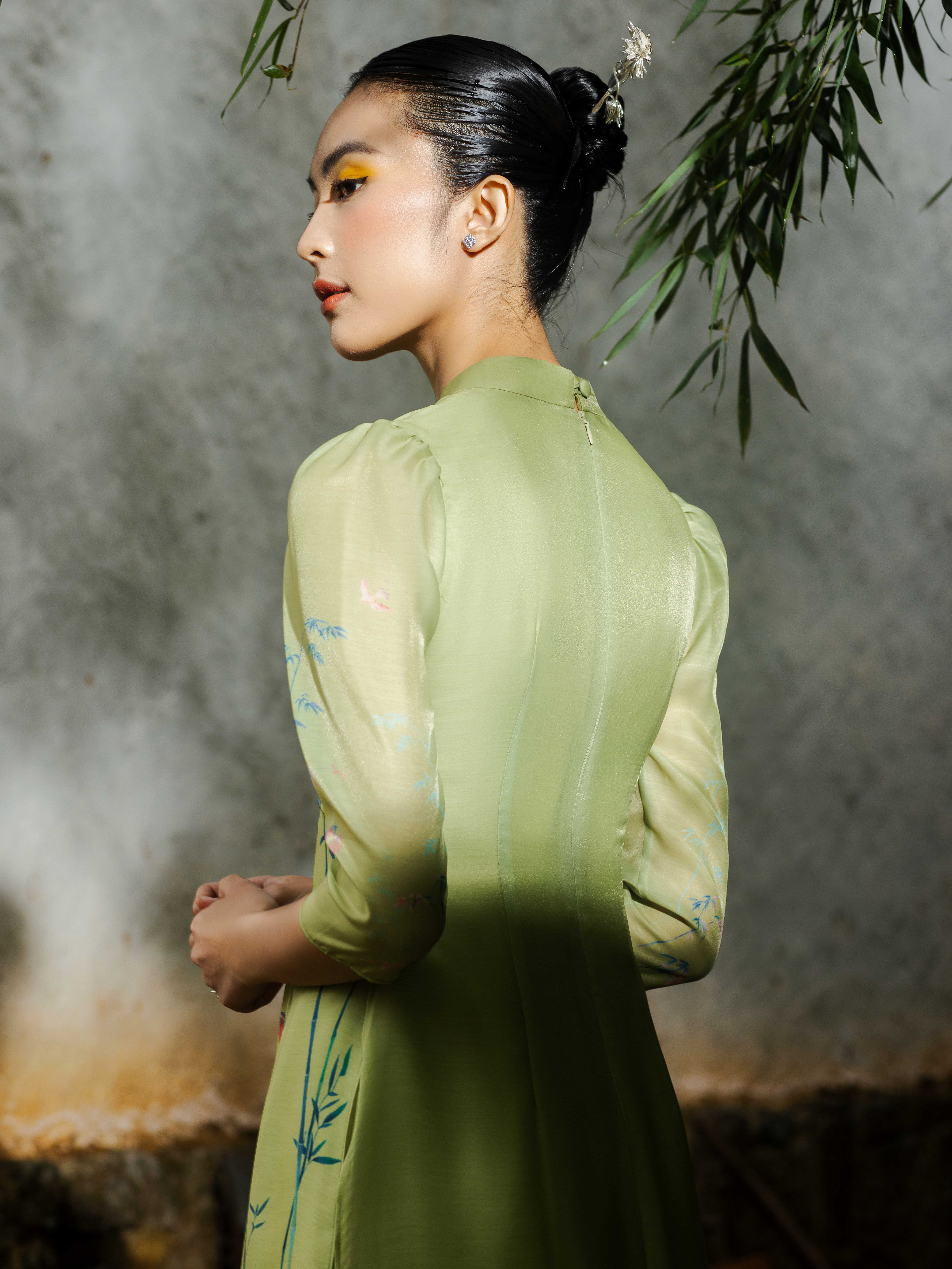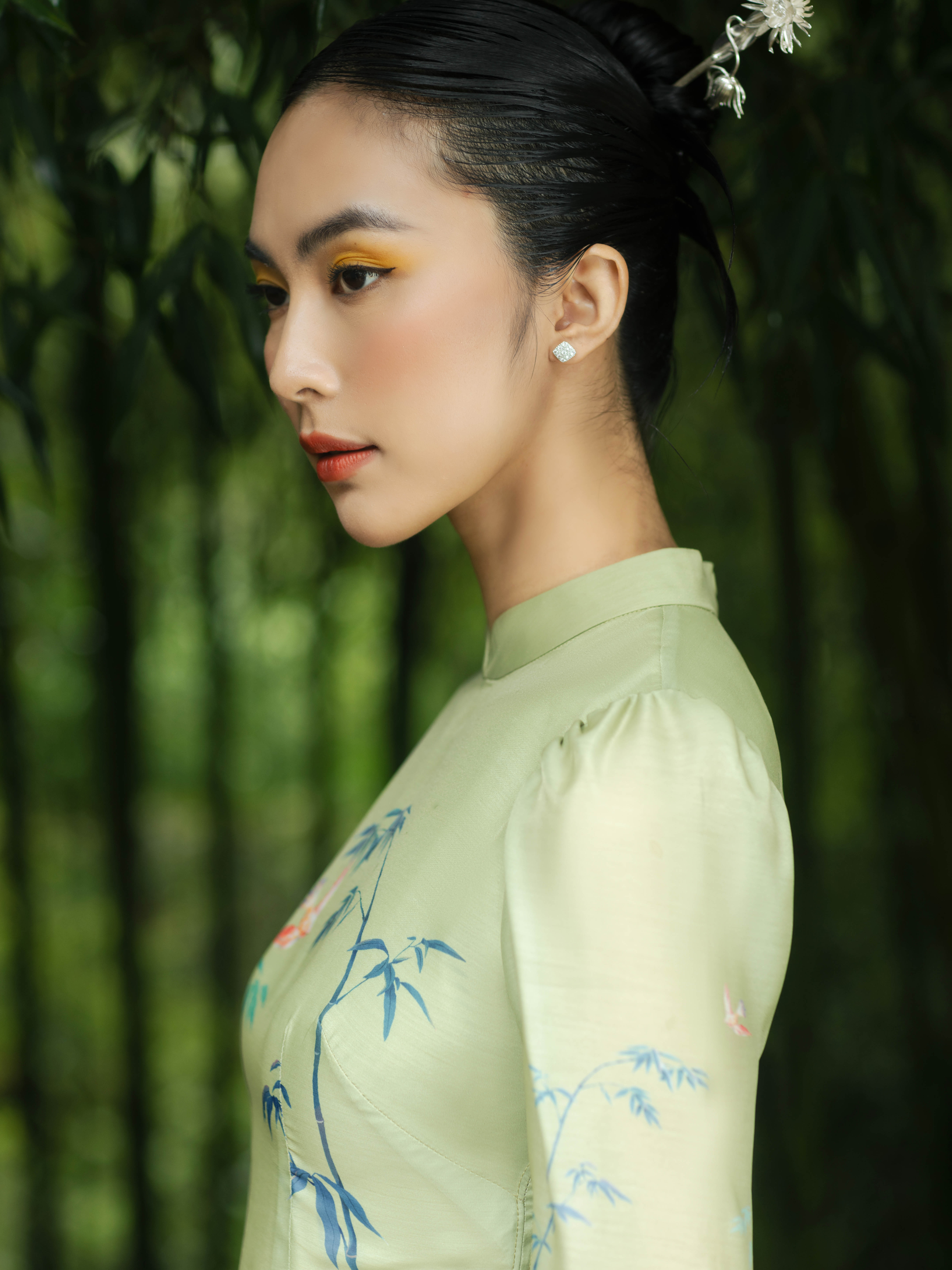 Áo Dài được sử dụng chất liệu tơ sống cao cấp với tone màu vàng/ xanh nhã nhặn.
